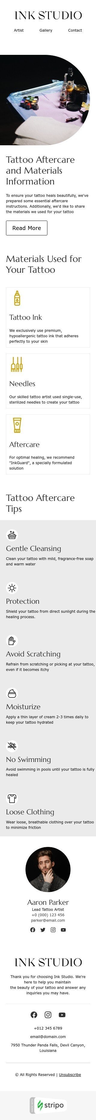 Modelo de e-mail de «Informações sobre cuidados posteriores e materiais de tatuagem» de boletins informativos para a indústria de tatuagem