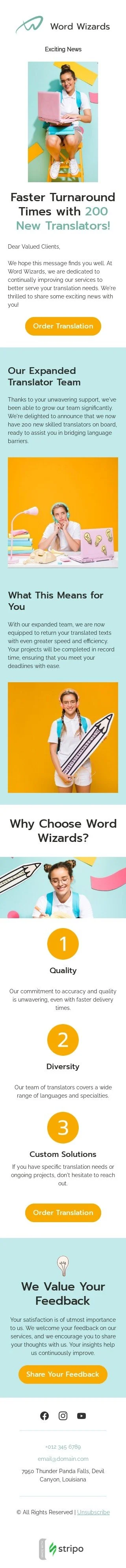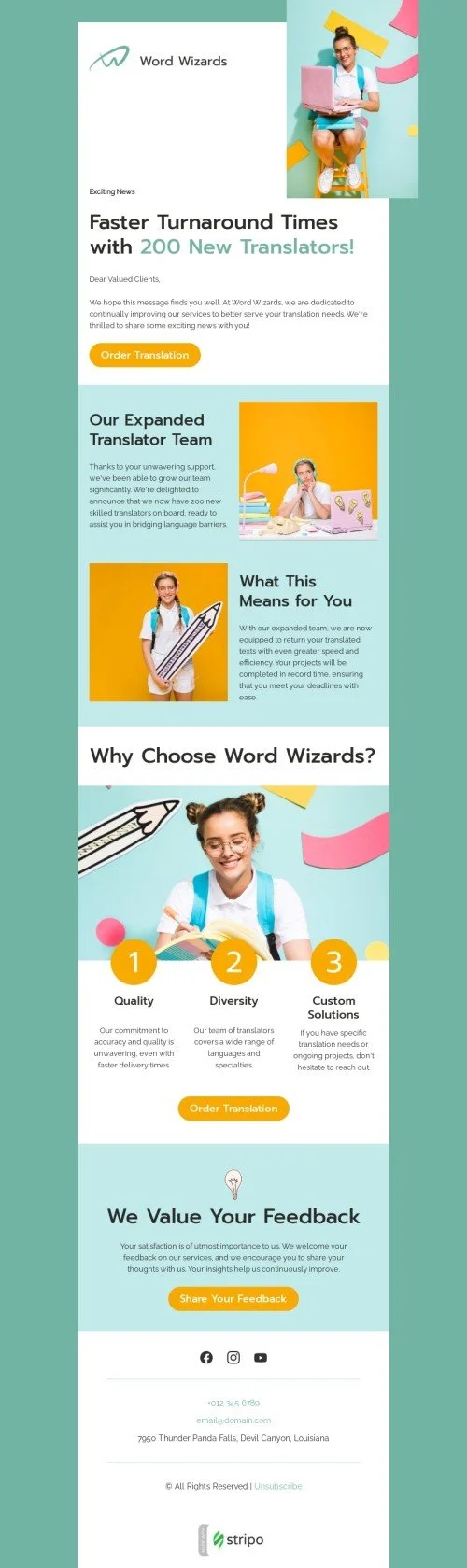 Modelo de e-mail de «200 novos tradutores» de promoção para a indústria de tradução