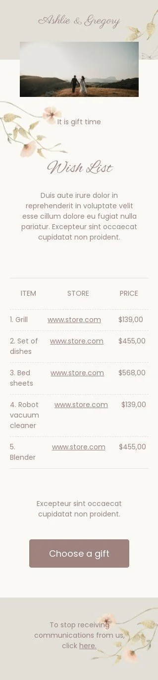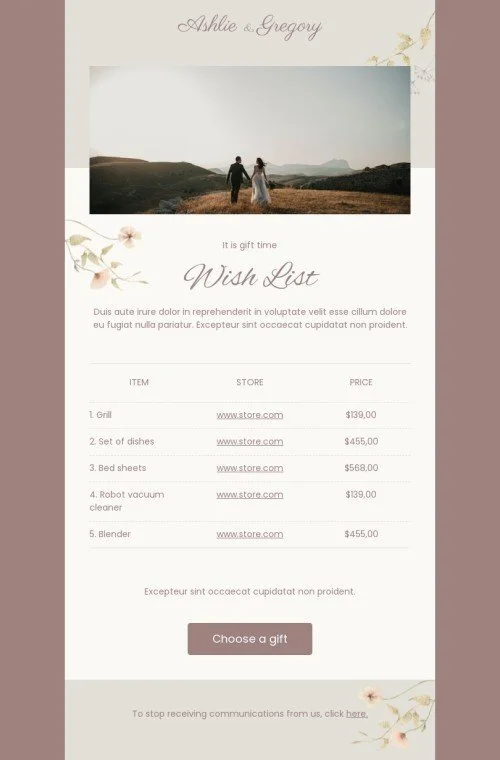 Modelo de e-mail de «Lista de desejos de casamento» de promoção para a indústria de hobbies