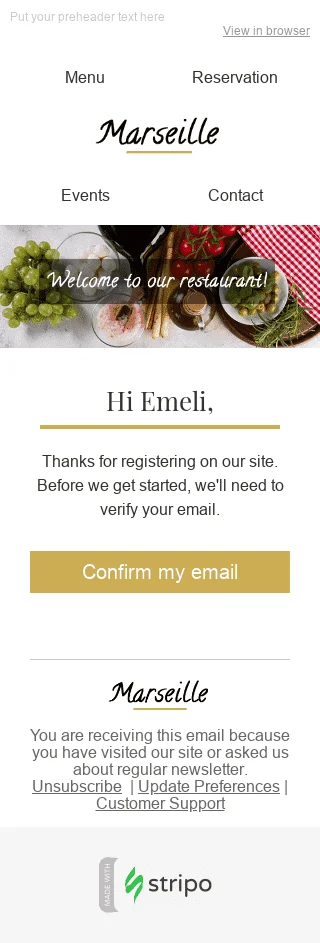 Nosso modelo de e-mail de boas-vindas "Novo conhecido" foi projetado para ajudar os restaurantes a se apresentarem profissionalmente a novos clientes. Este modelo fornece uma maneira calorosa e acolhedora de cumprimentar e agradecer a alguém por escolher jantar com você e fornecer uma visão geral de seu cardápio e serviços. Com este modelo, você pode se estabelecer como um restaurante hospitaleiro e confiável e preparar o cenário para uma experiência gastronômica memorável e agradável. Use este modelo para causar uma ótima primeira impressão e criar relacionamento com seus clientes.