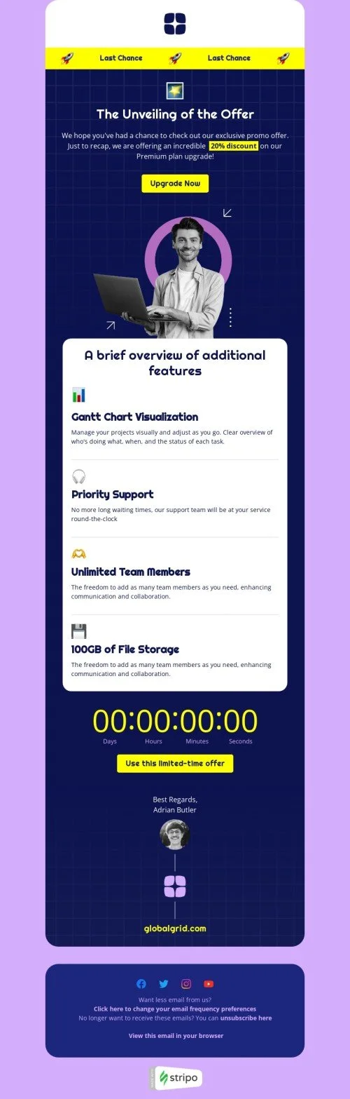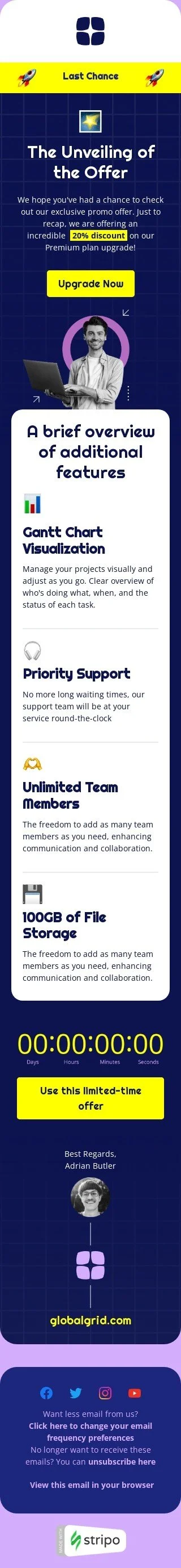 Introducing our "The Unveiling of the Offer" SaaS email template, designed to create excitement and anticipation around a new software or technology offering. With its captivating design, customizable content, and visually appealing graphics, this template showcases the features and benefits of the offer in a compelling way. From exclusive discounts to enhanced features, this email template entices users to explore the offering and take advantage of the limited-time opportunity. Don't miss out on this opportunity to generate buzz and drive conversions with our professional and impactful SaaS email template. Get ready for the grand unveiling of innovation and value.