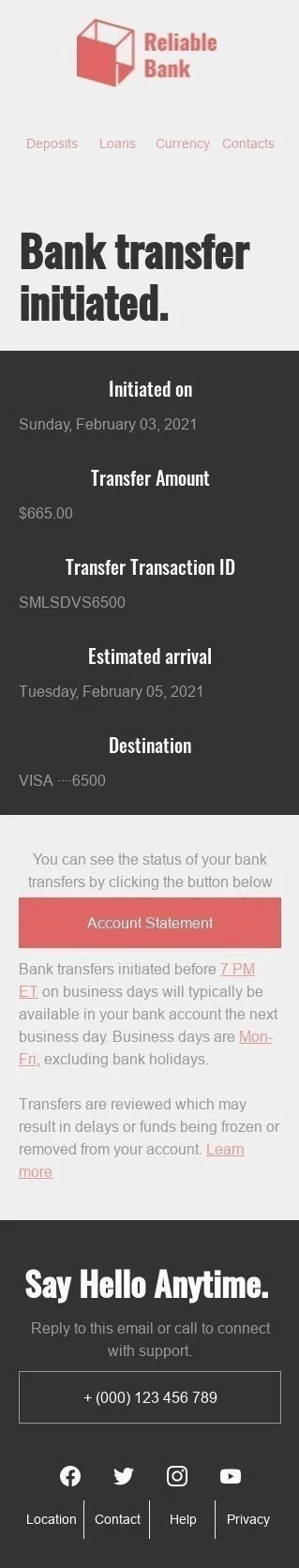 Modelo de E-mail de «Transferência bancária iniciada» de Transacional para a indústria de Finanças