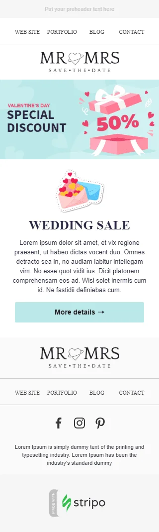 Celebre o amor com nosso modelo de e-mail "Dia do Amor", perfeito para a indústria da fotografia. Com seu design romântico, este modelo exibe seus pacotes e descontos de fotografia mais recentes, facilitando para os clientes agendarem sua próxima sessão de fotos. Este Dia dos Namorados, ajude os clientes a capturar sua história de amor com seus deslumbrantes serviços de fotografia. Se você está promovendo ofertas especiais ou pacotes, este modelo com certeza ajudará você a alcançar seu público-alvo e tornar este Dia dos Namorados inesquecível. Mostre seu talento e traga o amor à vida com este lindo modelo de e-mail!