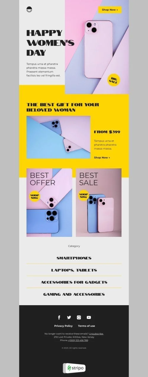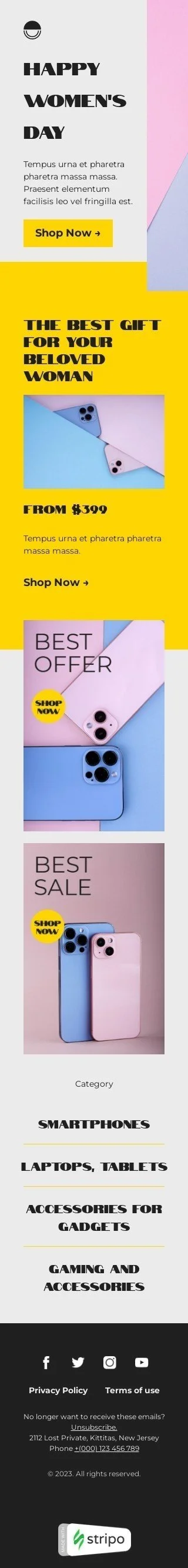 Celebrate Mulheres com the perfect gift for the special woman in your life with our "The Best Gift for Your Beloved Woman" email template designed for the gadgets industry. This customizable template features a modern and sleek design, with high-quality gadget imagery that will appeal to your tech-savvy subscribers. Use this template to promote your Women's Day gift offerings and showcase your unique and innovative gadgets. With a strong call-to-action button and an attractive design, this email template is sure to drive engagement and increase sales. Make this Women's Day unforgettable with our "The Best Gift for Your Beloved Woman" email template.
