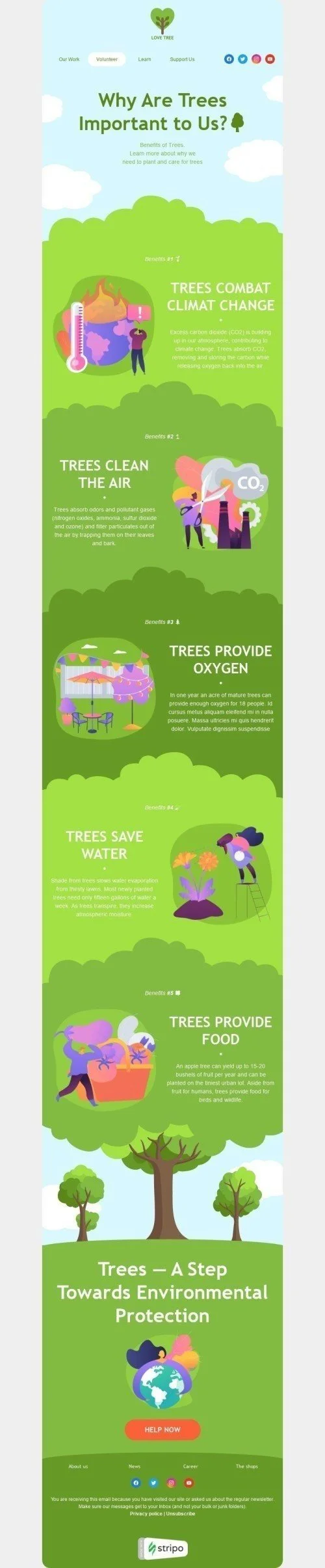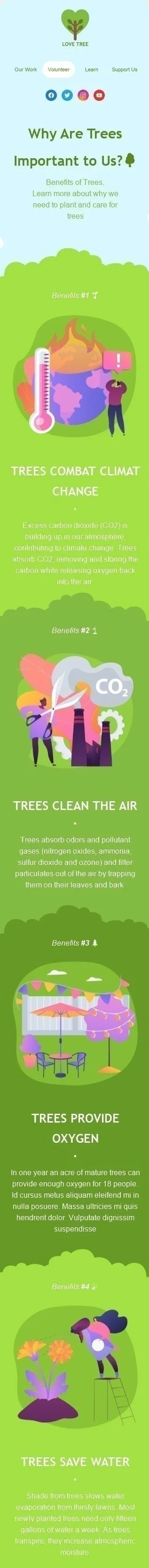 Nosso modelo de e-mail "Árvores Importantes para Nós" é a maneira perfeita de celebrar o Dia Mundial do Meio Ambiente na indústria de arrecadação de fundos. Este e-mail apresenta informações sobre a importância das árvores para o nosso meio ambiente, bem como maneiras que os clientes podem apoiar iniciativas de plantio de árvores. O modelo é totalmente personalizável e inclui imagens de belas árvores e cenas da natureza, além de uma mensagem incentivando os clientes a fazer a diferença em suas comunidades apoiando programas de plantio de árvores. Ideal para promover suas campanhas de arrecadação de fundos do Dia Mundial do Meio Ambiente, este e-mail aumentará a conscientização e impulsionará doações.
