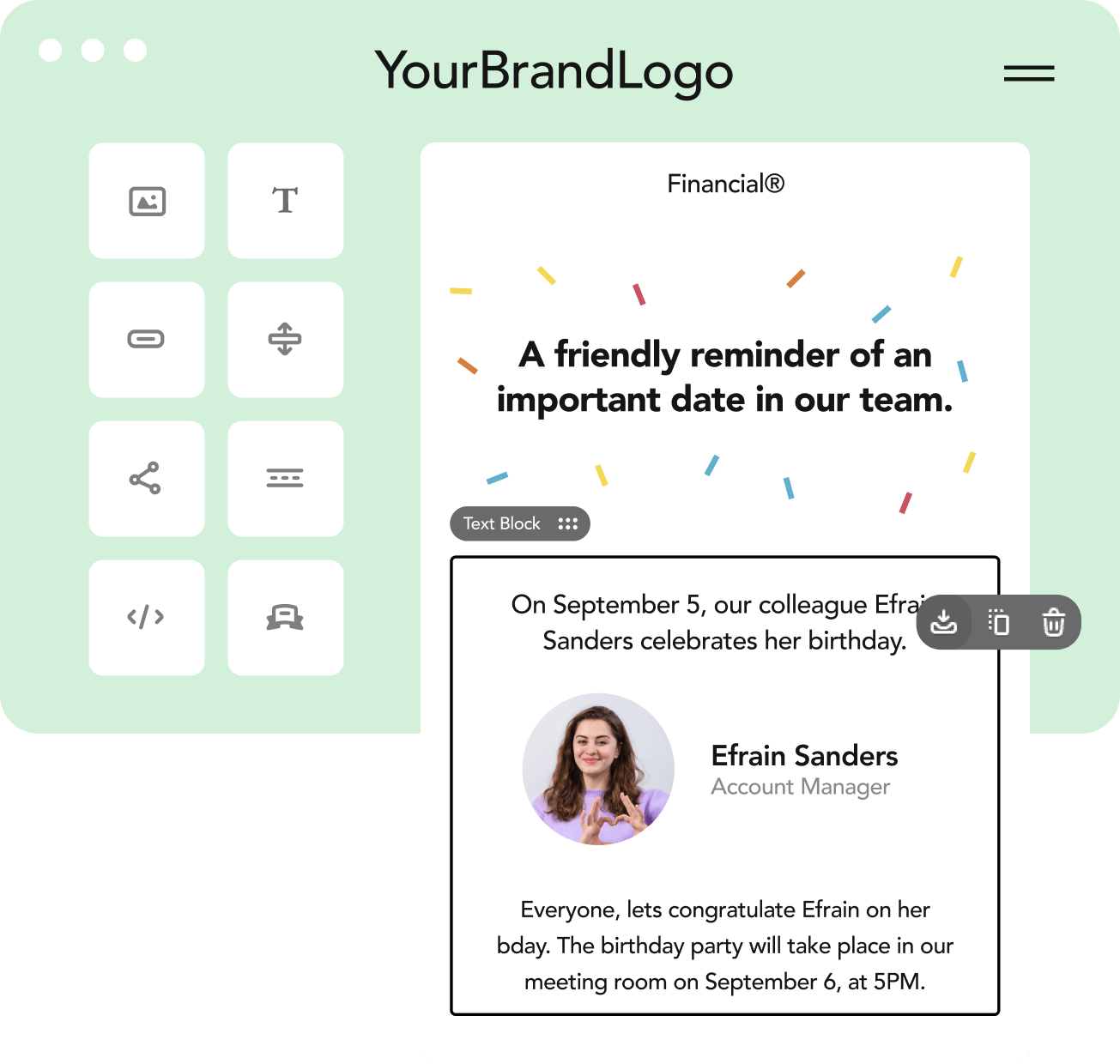 Позвольте пользователям создавать кастомные модули и повторно использовать их для ускорения разработки писем. Эта возможность автоматизирует процесс и помогает соблюдать целостность бренда.