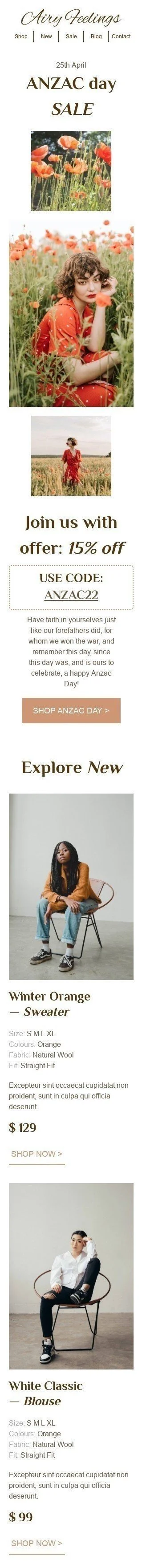 Шаблон письма к празднику День Анзак «Распродажа в день Анзак» для индустрии «Мода»