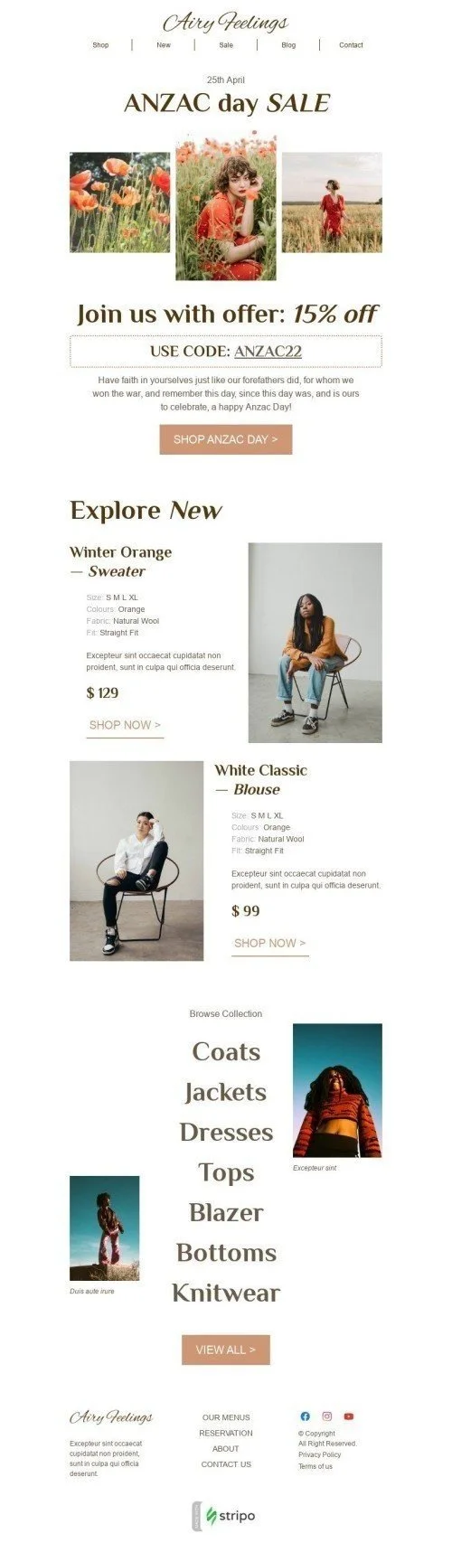 Почтите День АНЗАК с нашим "Распродажей ко Дню АНЗАК" шаблоном электронной почты, идеально подходящим для модной индустрии. Этот шаблон содержит изображения стильных модных предметов, а также патриотический акцент для продвижения ваших последних распродаж. Шаблон включает кнопку призыва к действию, которая облегчает клиентам возможность воспользоваться вашими скидками. С его современным и чистым дизайном вы можете легко настроить его в соответствии с эстетикой вашего бренда. Используйте этот шаблон, чтобы почтить храбрых мужчин и женщин Австралийского и Новозеландского армейских корпусов и увеличить продажи в этот День АНЗАК.
