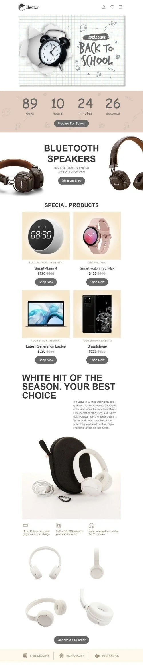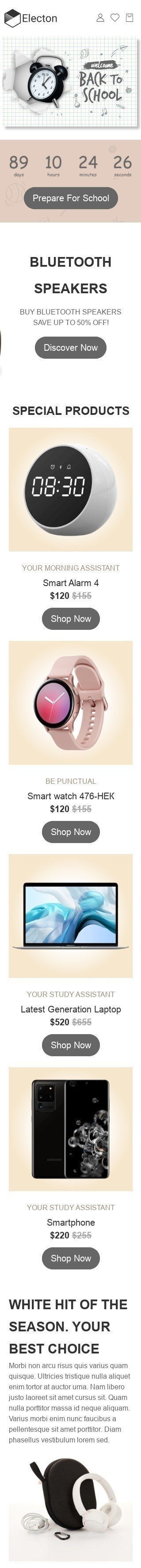 Приветствуйте студентов, возвращающихся в школу, с помощью нашего шаблона письма «С возвращением» для индустрии гаджетов. Идеально подходит для продвижения вашей продукции, содержит информацию о товаре, изображения, а также специальные акции или предложения. Шаблон имеет аккуратный и современный дизайн, с секциями для представленных товаров и специальных акций. В письме есть кнопка призыва к действию, побуждающая получателей посетить ваш сайт, чтобы приобрести товар или узнать больше о нем. Оно полностью настраиваемое, поэтому вы можете легко добавить в него собственный фирменный стиль и сообщение. Используйте наш шаблон письма «С возвращением», чтобы помочь ученикам подготовиться к новому учебному году с новейшими гаджетами и стимулировать продажи.