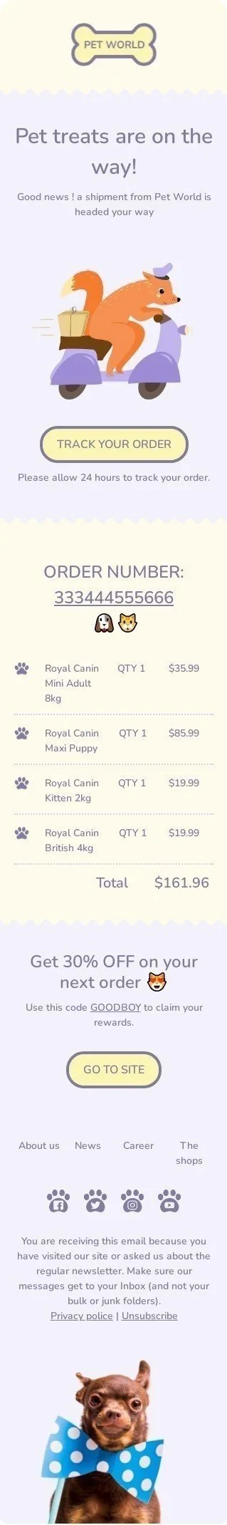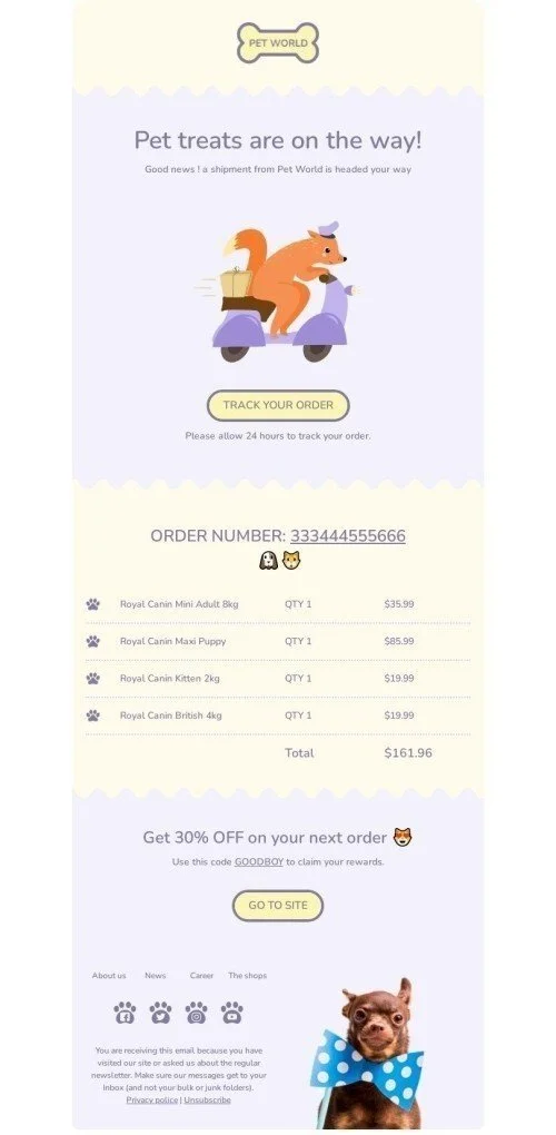 Шаблон письма «Лакомства для домашних животных уже в пути» тематики Доставка для индустрии «Животные»