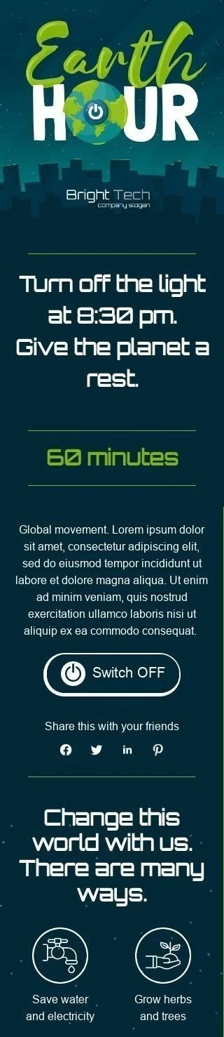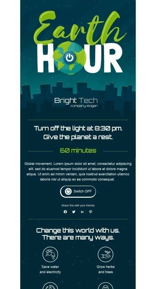 Отпразднуйте Земной день с нашим "Часом Земли" шаблоном электронной почты, разработанным для мебельной, интерьерной и DIY индустрии. Этот шаблон имеет потрясающий дизайн, который побуждает ваших клиентов выключить свет и присоединиться к глобальному движению по защите нашей планеты. Настройте его с вашим брендингом и сообщениями, чтобы привлечь вашу аудиторию и вдохновить их на действия ради устойчивого будущего. Используйте эту возможность, чтобы продемонстрировать ваши экологически чистые продукты и продвигать ваши зеленые инициативы. Не упустите шанс увеличить лояльность клиентов и продажи с нашим "Часом Земли" шаблоном электронной почты.