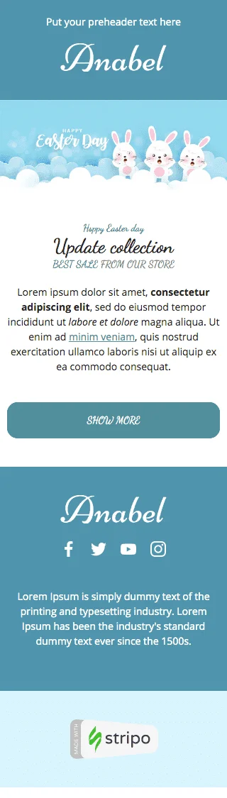 Представляем нашу новую пасхальную коллекцию с шаблоном электронного письма "Новые продукты", разработанным специально для индустрии моды. Этот настраиваемый шаблон содержит разделы для демонстрации ваших последних товаров и акций на пасхальную тематику. Добавьте индивидуальный штрих, предложив специальную пасхальную скидку или персонализированное сообщение, чтобы выразить свою благодарность клиентам. Яркий и игривый дизайн этого шаблона обязательно привлечет и вдохновит вашу аудиторию. Благодаря удобному формату вы можете создать уникальное пасхальное сообщение, которое подчеркнет предложения вашего бренда и вашу приверженность праздничному духу.