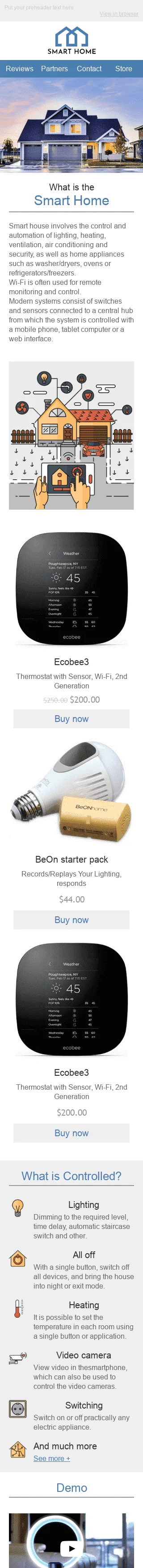 Обновите жилые пространства ваших клиентов с помощью шаблона "Умный дом" промо-емейла для отрасли мебели, интерьеров и DIY. Этот шаблон можно настроить для демонстрации ваших последних умных домашних продуктов и услуг. С его стильным и современным дизайном, а также убедительными сообщениями, вы можете представить свои продукты в наилучшем свете и увеличить продажи. Независимо от того, предлагаете ли вы специальное предложение на устройства умного дома или демонстрируете новую линейку мебели, шаблон "Умный дом" идеально подходит для увеличения конверсий и повышения доходов. Попробуйте его сегодня и подарите вашим клиентам умный и комфортный дом.