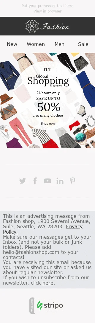 Подготовьте своих клиентов к Глобальному Шопинг Фестивалю с нашим "Так Много Одежды" шаблоном электронной почты, разработанным специально для модной индустрии. Продемонстрируйте свои последние стили, распродажи и акции с шикарным дизайном, который привлечет их внимание. С ясными призывами к действию и акцентом на демонстрацию изобилия модных вариантов, этот шаблон является идеальным способом продвигать ваш бренд и увеличивать продажи во время этого захватывающего шопинг-события. Независимо от того, продвигаете ли вы новинки, специальные предложения или сезонные коллекции, этот шаблон поможет вам достичь клиентов и побудить их обновить свой гардероб с вашими последними модными находками.