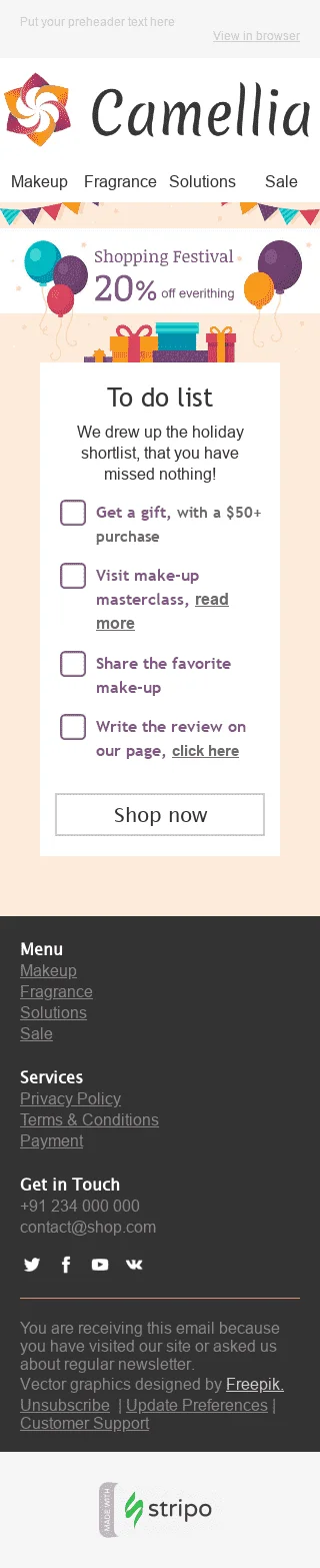 Сделайте покупки праздничных подарков простыми с нашим "Список подарков на праздник" шаблоном электронной почты, разработанным для индустрии красоты и личной гигиены. Представьте свои лучшие продукты и акции с потрясающим дизайном, который привлечет внимание ваших клиентов. С ясными призывами к действию и акцентом на праздничные цвета, этот шаблон - идеальный способ продвигать ваш бренд и увеличивать продажи в праздничный сезон. Независимо от того, продвигаете ли вы ограниченные предложения, сезонные наборы или эксклюзивные сделки, этот шаблон поможет вам достичь клиентов и побудить их обновить свою косметическую рутину с вашими последними продуктами.