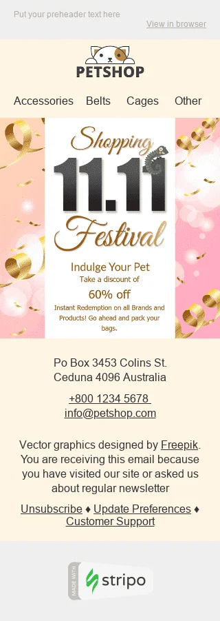 Принесите радость вашим клиентам с помощью шаблона электронной почты "Счастливые животные" для Глобального фестиваля покупок, идеально подходящего для индустрии домашних животных. Продемонстрируйте свои последние продукты и акции с помощью милого и яркого дизайна с веселыми животными. С привлекательными призывами к действию и акцентом на продуктах для домашних животных этот шаблон - отличный способ продвигать ваш бренд и увеличивать продажи во время этого фестиваля покупок. Независимо от того, предлагаете ли вы специальные предложения, новинки или идеи для подарков, этот шаблон поможет вам достичь клиентов и побудить их баловать своих пушистых друзей вашими продуктами.