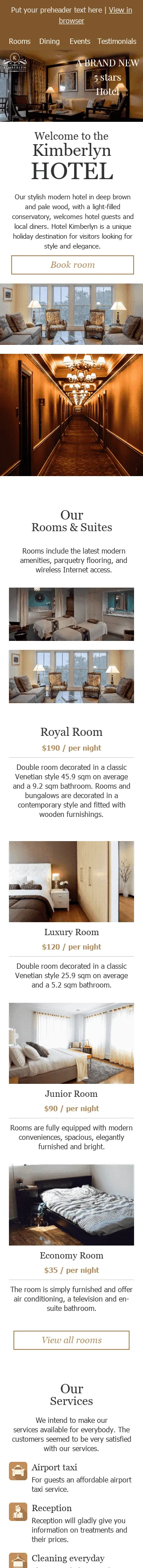 Мы рады представить наш последний Шаблон промо-емейла "5 Звёзд", специально разработанный для гостиничной индустрии. Этот шаблон идеально подходит для продвижения услуг и удобств вашего отеля среди ваших клиентов и подписчиков. Его утончённый и стильный дизайн подчеркнёт ваши роскошные предложения и безупречное гостеприимство. Шаблон полностью настраиваемый, что позволяет вам персонализировать его с помощью ваших собственных изображений и текста, чтобы соответствовать личности и сообщению вашего бренда. Используйте "5 Звёзд", чтобы продемонстрировать ваши пакеты номеров, варианты питания, спа-услуги и другие удобства, и оставьте неизгладимое впечатление на вашу аудиторию с непревзойдённым гостеприимством.