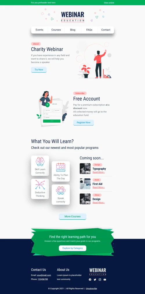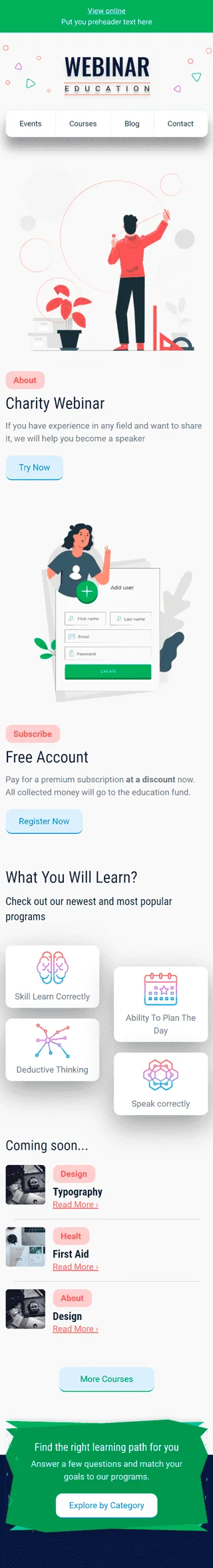 Получите ценные знания и добейтесь перемен с помощью нашего шаблона письма с приглашением «Безвозмездные знания» для некоммерческой и благотворительной сферы. Идеально подходит для продвижения бесплатного образовательного мероприятия или семинара, целью которого являются обучение и поддержка людей в комьюнити. Шаблон имеет аккуратный и профессиональный дизайн с четким сообщением о деталях мероприятия, таких как дата, время, место проведения и другая важная информация. В письме содержится кнопка призыва к действию, побуждающая получателей зарегистрироваться на мероприятие или узнать больше о теме. Оно полностью настраиваемое, поэтому вы можете легко дополнить его собственным фирменным стилем и текстом. Используйте наш шаблон письма с приглашением «Безвозмездные знания», чтобы вдохновить людей на изменения и приобретение ценных знаний.