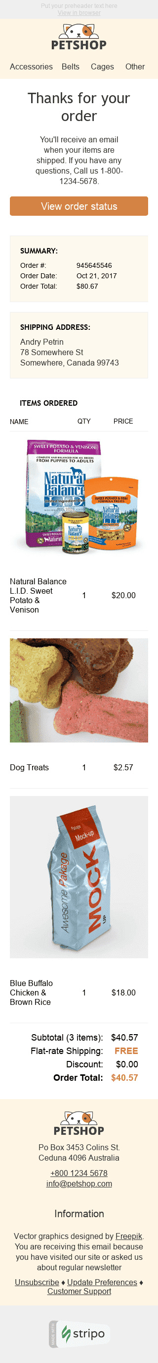 Шаблон письма о подтверждении заказа "Собачий корм" для индустрии "Животные"