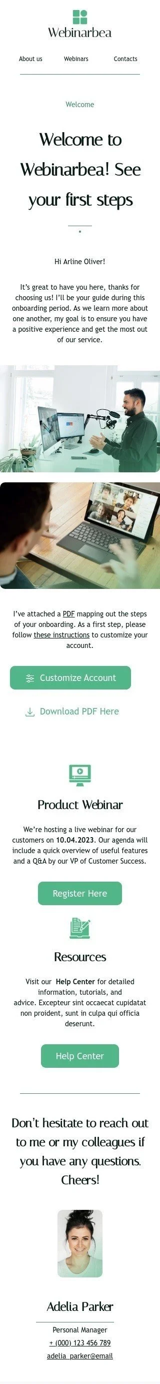 Наш шаблон промо-письма «Увидеть свои первые шаги» разработан с целью помочь компаниям, занимающимся проведением вебинаров, продвигать свои услуги и показывать преимущества участия в их мероприятиях. Этот шаблон предоставляет увлекательный способ подчеркнуть ценность вебинаров путем демонстрации первых шагов, которые слушатели будут делать на своем пути обучения. Шаблон имеет привлекательный и профессиональный дизайн, подчеркивающий важность обучения и роста. Письмо может содержать информацию о темах, рассматриваемых на вебинарах, преимуществах участия в них, а также расписание предстоящих вебинаров. Оно также может включать кнопку призыва к действию для упрощения процесса регистрации клиентов. Используйте этот шаблон для продвижения вебинаров и помогите своим клиентам узнать о преимуществах участия в них.