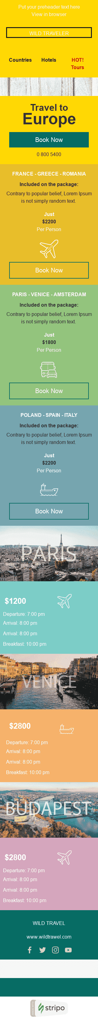Шаблон рекламного письма "Дикий путешественник" — идеальный инструмент для продвижения приключенческих туров и туристических пакетов. Дизайн шаблона привлекателен и визуально приятен, с потрясающими изображениями экзотических мест и захватывающих приключений. Текст убедителен и побуждает читателей дать волю своему желанию приключений и исследовать новые горизонты. Благодаря настраиваемым функциям вы можете легко адаптировать шаблон под свой бренд и конкретные предложения. Этот шаблон электронного письма — эффективный способ привлечь больше клиентов в ваш туристический бизнес и увеличить количество бронирований.