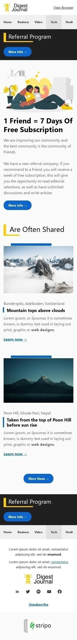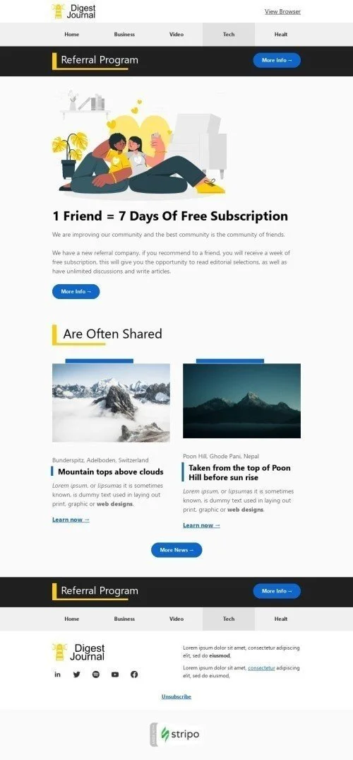 Шаблон письма для рефералов «Улучшение сообщества» идеально подходит для изданий и блоггеров, которые хотят усовершенствовать свою работу с комьюнити. Этот шаблон обеспечивает отличную связь с читателями и подписчиками и побуждает их приводить других людей на ваш сайт или блог. Элегантный дизайн и простой в использовании интерфейс позволяют легко начать работу, а встроенные инструменты упрощают настройку шаблона согласно специфике вашего бренда. Так что если вы ищете способ повысить вовлеченность и охват аудитории, это идеальный инструмент!