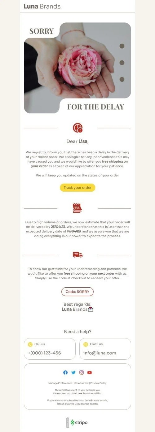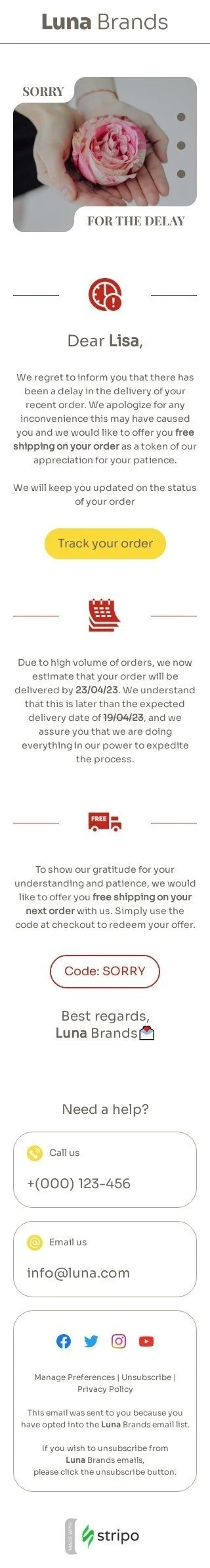 Наш шаблон электронного письма "Искреннее извинение" является идеальным инструментом для модных компаний, чтобы общаться с клиентами о задержках с доставкой. Шаблон отличается сострадательным и понимающим тоном, с настраиваемым контентом и визуально привлекательной графикой. С четким сообщением это письмо признает задержку и приносит искренние извинения за любые причиненные неудобства. Оно также предлагает варианты для клиентов связаться со службой поддержки для дальнейшей помощи. Не упустите возможность поддерживать положительные отношения с вашими клиентами, несмотря на неожиданные задержки, с нашим профессиональным и впечатляющим шаблоном электронного письма.