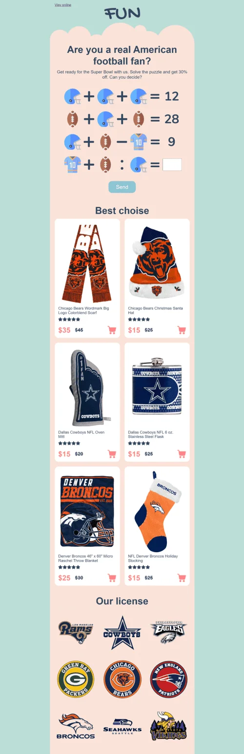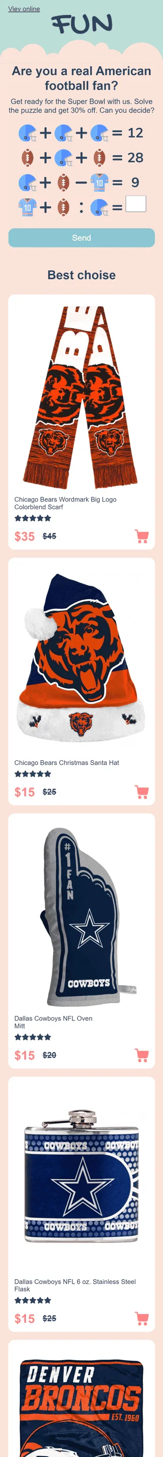Отпразднуйте самую важную игру года с помощью шаблона электронного письма "Весело" для Суперкубка! Этот шаблон идеально подходит для компаний спортивной индустрии, стремящихся вызвать ажиотаж и увеличить продажи во время Суперкубка. Благодаря своему игривому дизайну, клиенты с удовольствием присоединятся к веселью и приобретут любимую атрибутику. Повысьте вовлеченность и продажи с помощью этого интерактивного шаблона электронного письма, рекламирующего товары первой необходимости для игрового дня, сувенирную продукцию и многое другое. Увеличьте свою прибыль и сделайте этот Суперкубок самым запоминающимся!