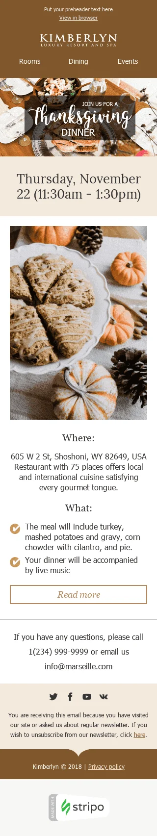 Отпразднуйте День благодарения в стиле с шаблоном электронной почты "Вкусный ужин", разработанным для гостиничной индустрии. Этот шаблон имеет теплый и уютный дизайн, который демонстрирует аппетитные блюда, приготовленные нашими лучшими шеф-поварами. Он включает раздел, который подчеркивает удобства и услуги отеля, побуждая гостей провести праздник с нами. Электронное письмо завершается кнопкой призыва к действию, которая направляет гостей забронировать свои номера онлайн или по телефону. Этот настраиваемый шаблон - идеальный способ продвигать ужин в вашем отеле на День благодарения и привлечь больше гостей, чтобы насладиться праздником с вами.