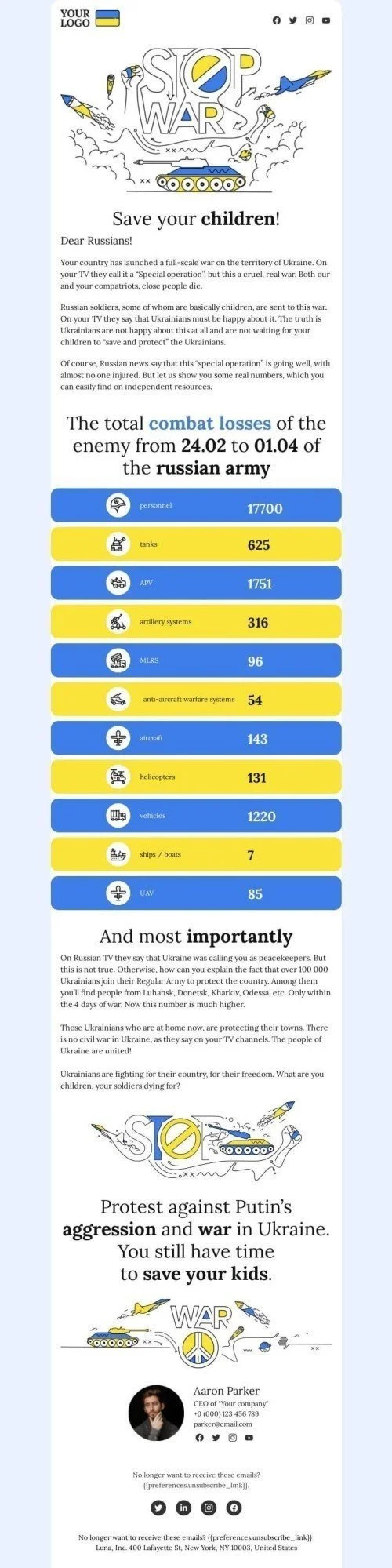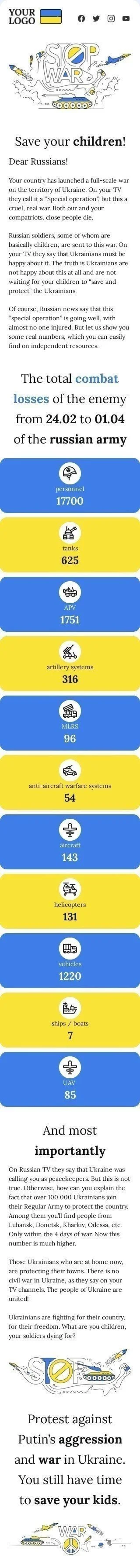 Если вы хотите привлечь внимание к продолжающемуся конфликту в Украине, наш шаблон электронного письма "Месяц противостояния" - идеальное решение. Его мощный дизайн эффективно подчеркивает срочность ситуации, с четкими сообщениями и сильным вдохновляющим людей на действия. Этот шаблон включает настраиваемый контент и визуально привлекательную графику, что делает его идеальным инструментом для взаимодействия с вашей аудиторией и побуждения их поддержать усилия по прекращению конфликта. Не упустите возможность внести изменения и поддержать дело в Украине с нашим эффективным шаблоном электронного письма.