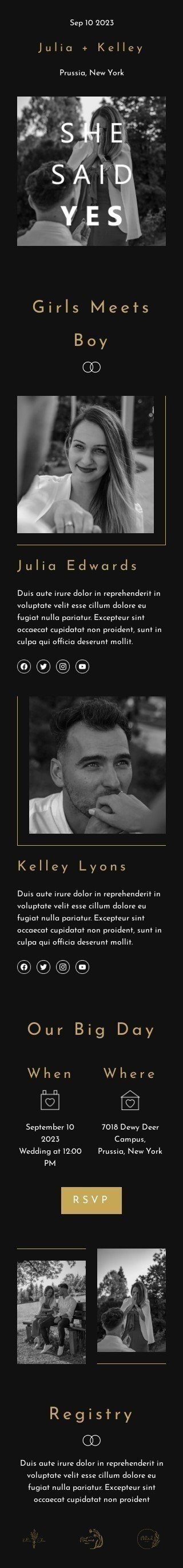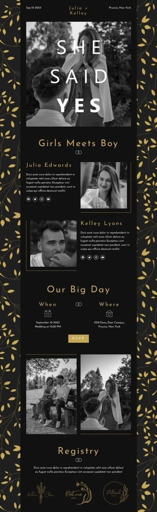 Запечатлейте радость вашего особенного дня с помощью нашего шаблона письма с приглашением на свадьбу «Она сказала да». Этот шаблон идеально подходит для фотографов и других компаний, связанных со свадебными торжествами, которые хотят пригласить клиентов, партнеров или друзей на свою свадьбу. Шаблон имеет романтичный и элегантный дизайн с красивыми изображениями и четким описанием деталей свадьбы, таких как дата, время, место, дресс-код и другая важная информация. Письмо содержит четкую кнопку призыва к действию, чтобы попросить получателей подтвердить участие. Оно полностью настраиваемое, поэтому вы можете легко дополнить его собственным фирменным стилем и текстом. Поделитесь восторгом и счастьем от помолвки, используя наш шаблон письма с приглашением на свадьбу «Она сказала да».