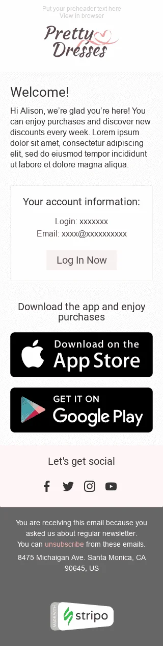 Шаблон письма с приветствием клиента после регистрации "Информация об аккаунте" для индустрии "Мода"