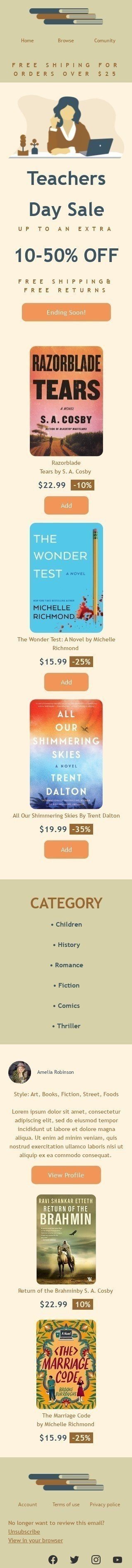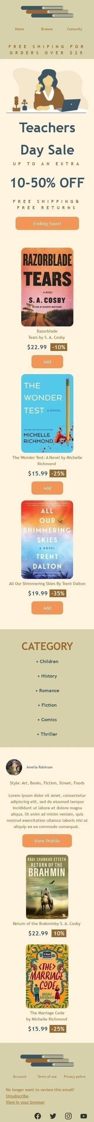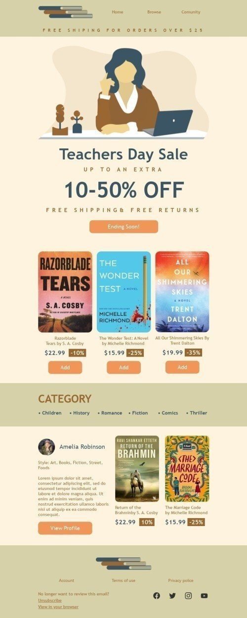 Отпразднуйте Всемирный день учителей с экономией и стилем! Шаблон электронного письма "Распродажа ко Дню учителя" идеально подходит для индустрии книг, подарков и канцелярских товаров. С праздничным дизайном и ясными calls-to-action этот шаблон демонстрирует ваши последние распродажи и скидки на товары, идеально подходящие для учителей. Независимо от того, продвигаете ли вы новинки, распродажи или специальные мероприятия, этот шаблон поможет вам достичь клиентов и побудить их выразить свою благодарность учителям в их жизни. Так что помогите вашим клиентам отпраздновать Всемирный день учителей стильно с шаблоном электронного письма "Распродажа ко Дню учителя"!