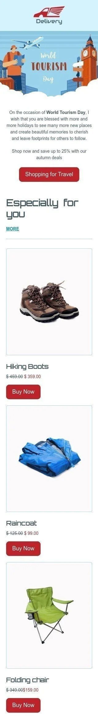 Отпразднуйте Всемирный день туризма с нашим стильным "Лучший турист" шаблоном электронной почты для модной индустрии. Продемонстрируйте свои последние коллекции моды, вдохновленные путешествиями, с помощью этого привлекательного шаблона. С потрясающей фотографией путешествий, элегантной типографикой и смелыми call-to-actions, этот шаблон обязательно привлечет внимание ваших клиентов и побудит их исследовать мир со стилем. Используйте Всемирный день туризма по максимуму и вдохновите своих клиентов на путешествия с шаблоном электронной почты "Лучший турист".