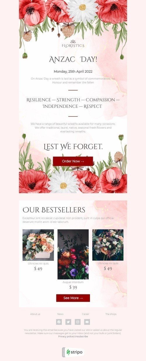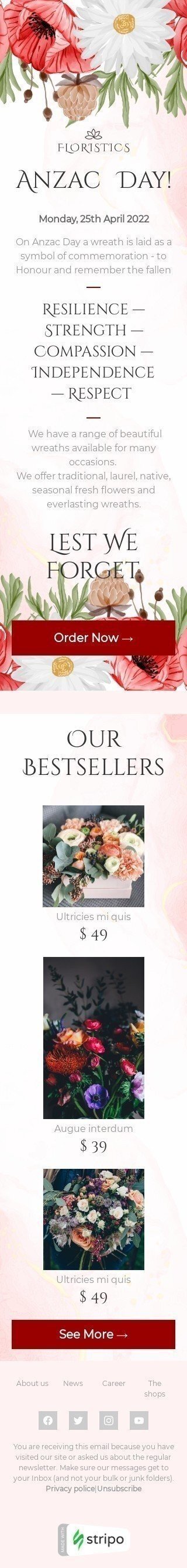 Remember the fallen heroes of Anzac Day with our "Honour and Remember the Fallen" Email Template, designed exclusively for the Gifts & Flowers industry. This email features our collection of heartfelt sympathy bouquets and arrangements that express gratitude and honor to those who served our country. The template is fully customizable and includes images of our elegant floral designs, as well as a personalized message encouraging customers to send a thoughtful tribute to honor the brave men and women who fought for our freedom. Ideal for promoting your Anzac Day offerings, this email will increase customer engagement and drive sales.