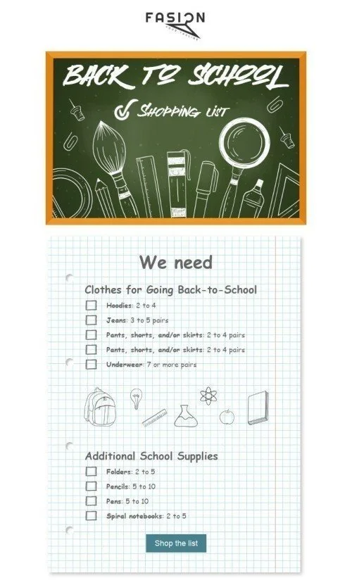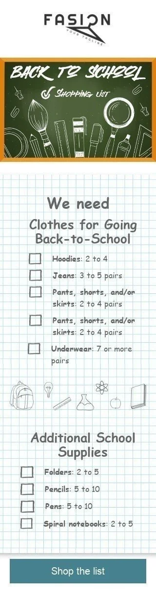 Get ready for the school season with our "Shopping List" Back to School Email Template designed for the fashion industry. Showcase your latest back-to-school collection with customizable messaging and attractive images that appeal to students and parents. Use this opportunity to highlight your brand's commitment to quality, style, and affordability. Encourage your customers to start the new school year with a fresh wardrobe and offer special promotions to increase sales. Don't miss out on the chance to boost your back-to-school revenue with our "Shopping List" Email Template.