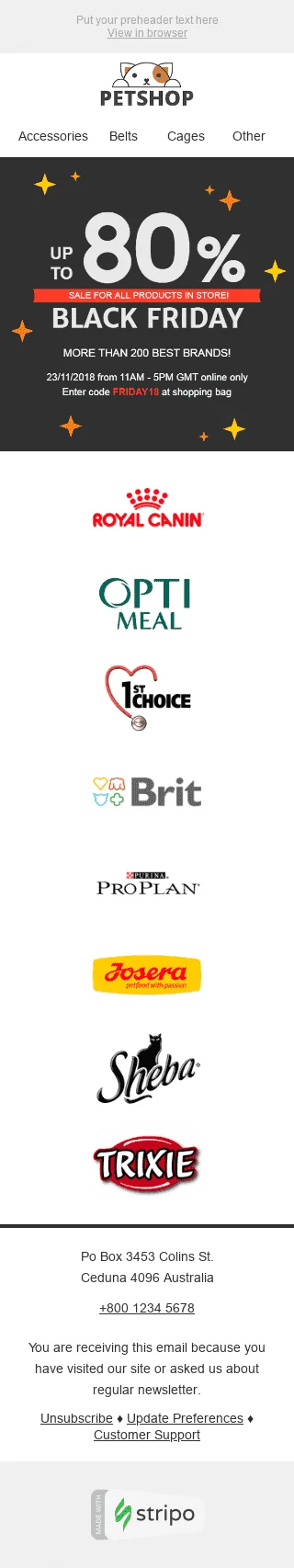 Looking for a way to promote your pet store or animal rescue during the biggest shopping day of the year? Look no further than our Black Friday Email Template "Love and Care" for the Pets industry. This template features a fun and colorful design, showcasing your best deals and most adorable pets. With a clear call-to-action and an emphasis on love and care for your furry friends, this template is the perfect way to engage with pet lovers and increase sales. Get ready to give your pets the love and care they deserve this Black Friday!