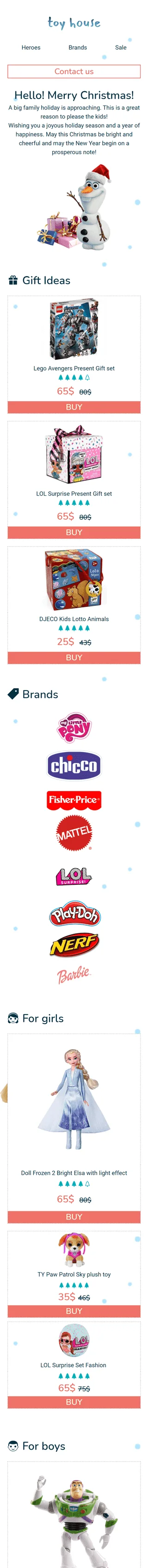 Bring some extra holiday magic to the little ones with our "Toy House" Christmas email template, designed specifically for the Kids Goods industry. This customizable template features sections to showcase your latest toy collection and promotions, along with a fun and playful design that is sure to engage and inspire your audience. Add a personal touch by offering a special Christmas discount or personalized message to show your appreciation for your customers. With its easy-to-use format, you can create a unique and festive message that highlights your brand's offerings and dedication to the holiday spirit.