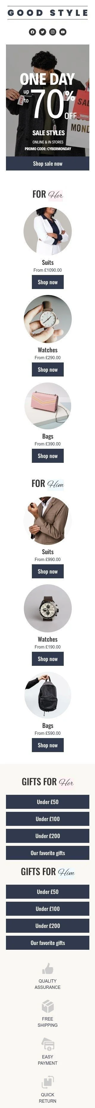 Make the most of Cyber Monday with "One day sale" email template for the fashion industry. This eye-catching and attention-grabbing template is designed to promote your fashion business and drive sales during the busiest shopping day of the year. It features bold headlines and bright colors to grab the attention of your subscribers, and includes sections for your latest collections, best-selling products, and a call-to-action to encourage shoppers to take advantage of your one day sale. Customize the template with your own branding, messaging, and product images to create a memorable and impactful email campaign for your fashion business.