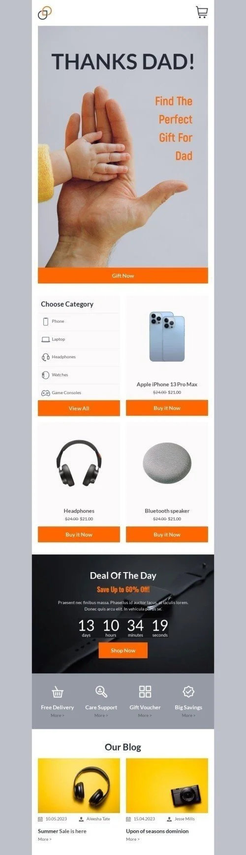 Mark Father's Day with our "Thanks Dad" email template for the gadgets industry. This personalized template features a modern design with a call to action that urges subscribers to discover the perfect Father's Day gift. Use this template to present your latest gadgets and express gratitude to all fathers. With a powerful call-to-action button and visually appealing design, this email template is sure to increase engagement and drive up your Father's Day sales. Don't miss the chance to celebrate Father's Day and express appreciation to all dads with our inspiring email template.