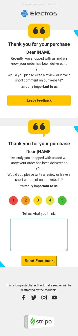 Our "Thank you for your purchase" Follow-up Email Template is the perfect way to show appreciation to your customers in the gadgets industry. With its sleek design and personalized message, this template invites readers to feel valued and satisfied with their recent purchase. Customizable with your own branding and message, this template is an effective way to increase customer loyalty and generate repeat business. Ideal for tech companies, gadget retailers, and online sellers, this template is sure to leave a lasting impression and make customers feel appreciated.