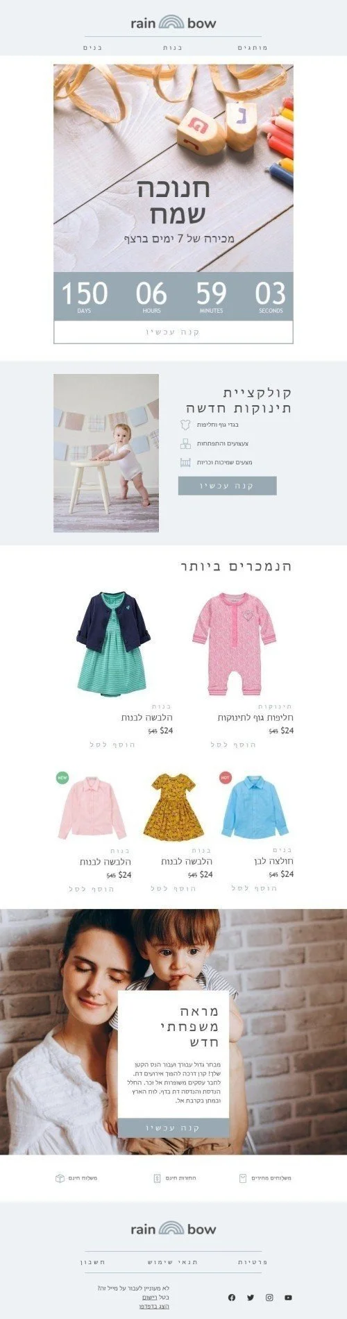 Celebrate Hanukkah with style and savings! Our "Sale 7 days in a row" email template is perfect for the fashion industry. With its festive and stylish design, this template showcases your latest sales and discounts. This template is the perfect way to promote your brand and reach customers during this important holiday. Whether you're promoting new arrivals, sales, or special events, this template will help you reach customers and encourage them to update their wardrobe for Hanukkah. Show your customers how much you appreciate them with this festive email template!