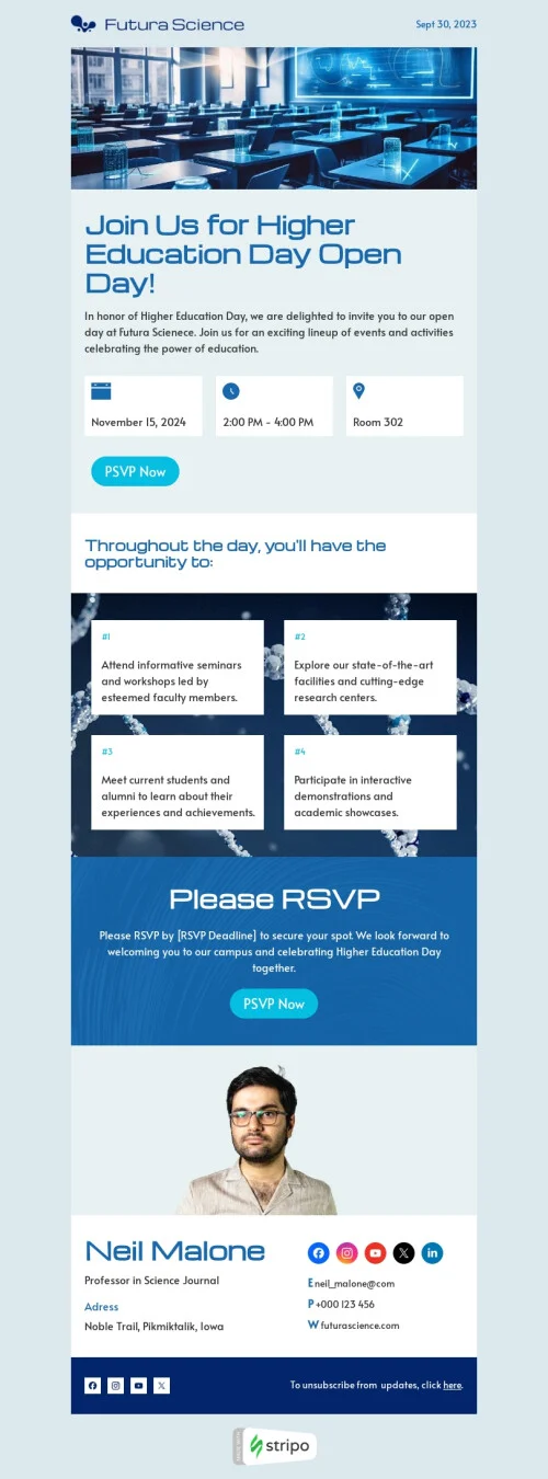 Experience Higher Education Day with our "Open Day" email template, exclusively crafted for the education industry. This template invites prospective students and families to discover your institution's offerings, facilities, and programs firsthand. Showcase virtual tours, faculty introductions, and interactive sessions seamlessly. Whether for high school seniors, transfer students, or inquisitive parents, this template simplifies communication and sets the standard for engaging emails on Higher Education Day. Trust its effectiveness to highlight your campus culture, academic achievements, and student support services, fostering enthusiasm and confidence among future applicants.