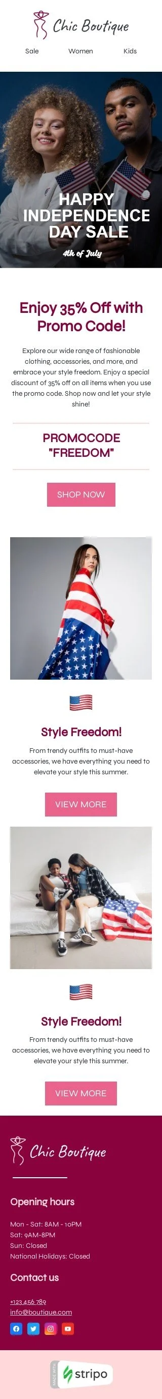 Celebrate Independence Day in style with our "Style Freedom" email template designed for the fashion industry. This template showcases a trendy and patriotic design that captures the spirit of the holiday, with customizable content and visually appealing graphics. Use this template to promote your special Independence Day offers, discounts, or new collections. Grab the attention of your audience and inspire them to embrace their style freedom this holiday. Don't miss out on this opportunity to engage with your customers and boost sales with our professional and impactful email template.
