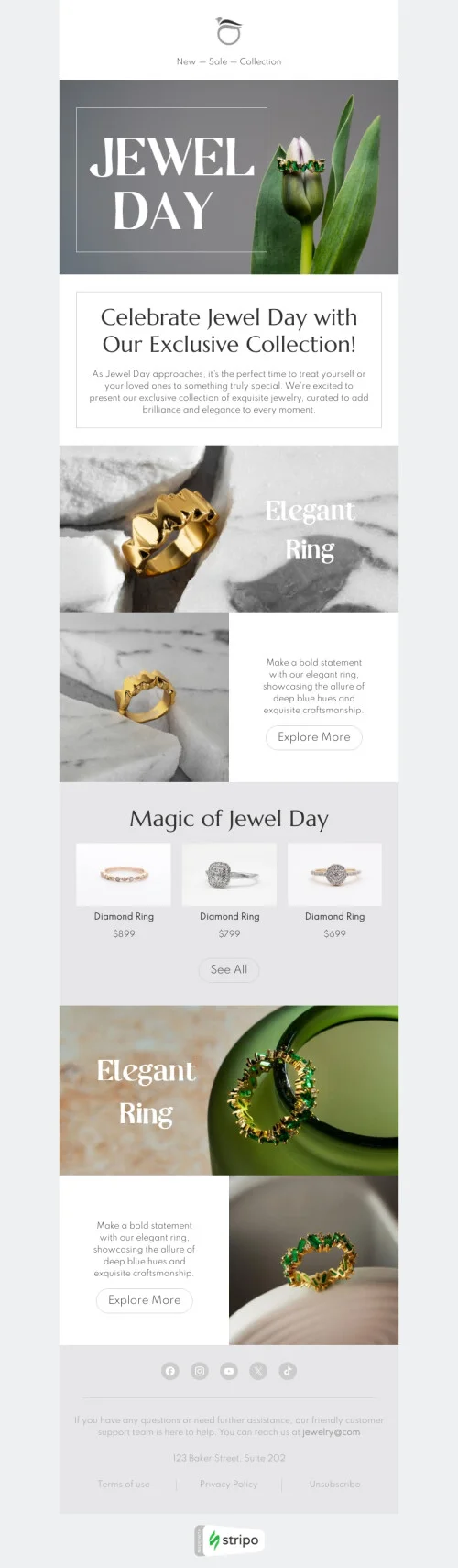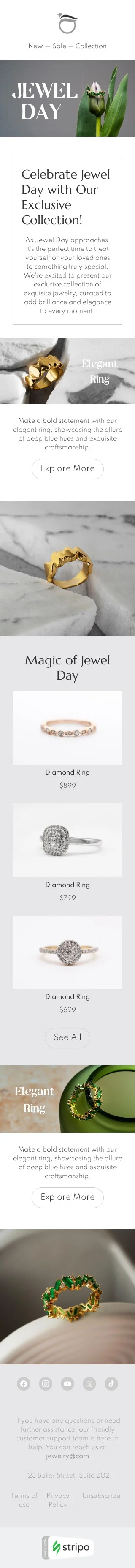 Celebrate Jewel Day with "Elegant Ring" email template, curated for the jewelry industry. This template exudes sophistication, featuring exquisite ring designs that epitomize elegance. Share exclusive collections, limited-time offers, or personalized engraving options effortlessly. Whether for engagements, anniversaries, or self-indulgence, this template simplifies communication and sets the standard for captivating emails in the jewelry industry. Trust its efficiency to entice your audience and inspire them to adorn themselves or their loved ones with timeless elegance on Jewel Day.