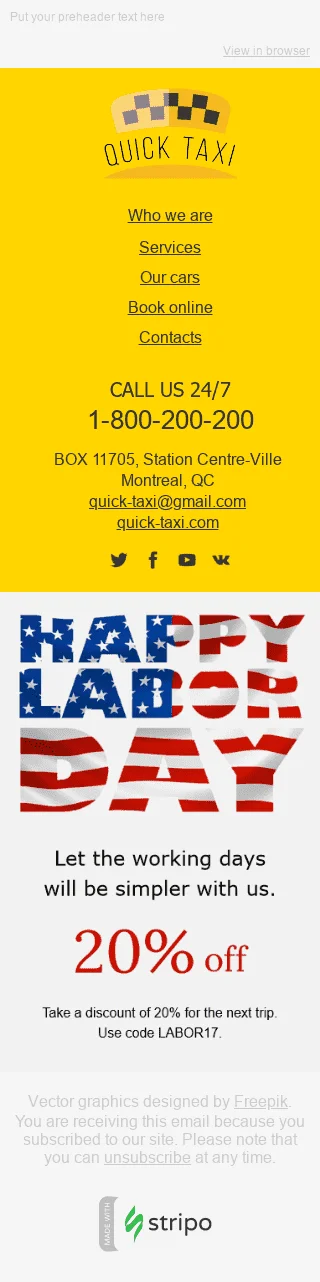 The "Comfortable Trips" Labor Day Email Template is perfect for auto and moto enthusiasts looking to promote their travel options during this national holiday. With its sleek design and persuasive language, this template invites readers to hit the road in comfort and style. Customizable with your own details and message, this template is an effective way to showcase your vehicles and generate bookings. Ideal for car rental agencies, car dealerships, and motorcycle rental companies, this template is sure to capture the attention of those looking to travel with ease and in style.
