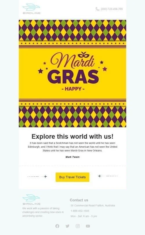 Join the Mardi Gras festivities with our "Buy Travel Tickets" Email Template, perfect for the travel industry. This template features bold colors and a lively design to showcase your Mardi Gras travel promotions and packages. Customize it with your branding and messaging to engage your audience and increase bookings. Use this opportunity to highlight the unique Mardi Gras experiences your travel agency has to offer and invite your customers to celebrate with you. Don't miss out on the chance to increase customer satisfaction and sales with our "Buy Travel Tickets" Email Template.