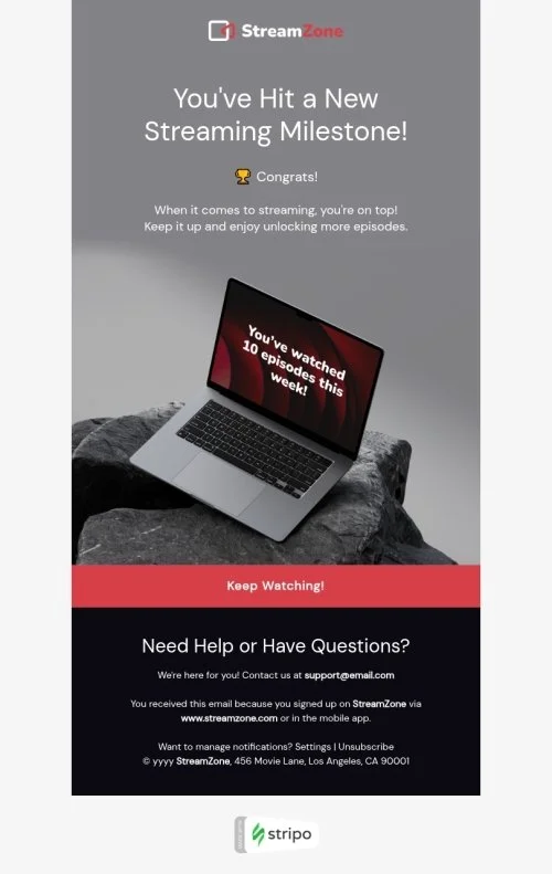 Celebrate your success with "New Streaming Milestone" email template, designed for the movies industry. This template highlights a major achievement, such as reaching a new viewership milestone or celebrating a popular film or series. It conveys gratitude to your audience, offering a celebratory tone and sharing exciting updates about the milestone. Whether it's a record-breaking release or a special anniversary, this template engages your viewers, encourages continued streaming, and strengthens their connection to your brand. Trust its impact to inspire enthusiasm and foster lasting loyalty within your audience.