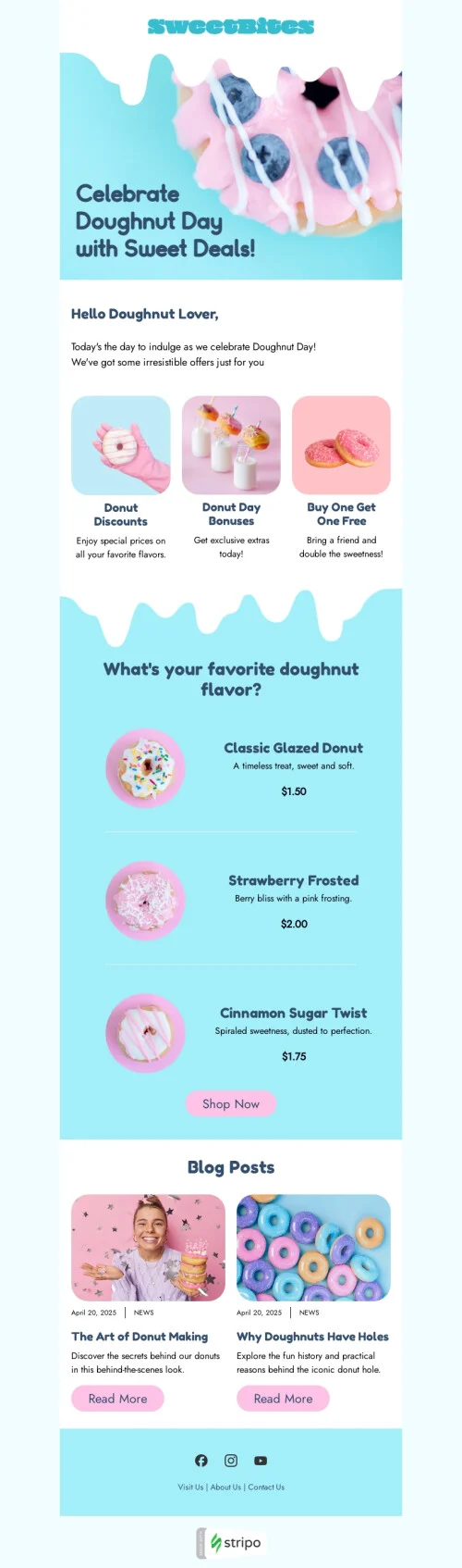 Indulge in the sweetness of National Doughnut Day with our "Sweet Deals" email template, perfect for the food industry. This template entices recipients with irresistible offers on a variety of doughnut flavors, from classic favorites to gourmet delights. Share mouthwatering images, special promotions, and limited-time discounts effortlessly. Whether for doughnut enthusiasts, foodies, or casual snackers, this template simplifies communication and sets the standard for enticing emails on National Doughnut Day. Trust its effectiveness to delight customers, drive sales, and celebrate the joy of delicious treats.