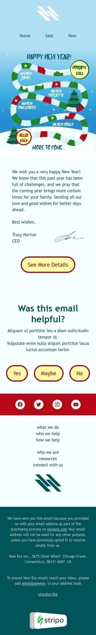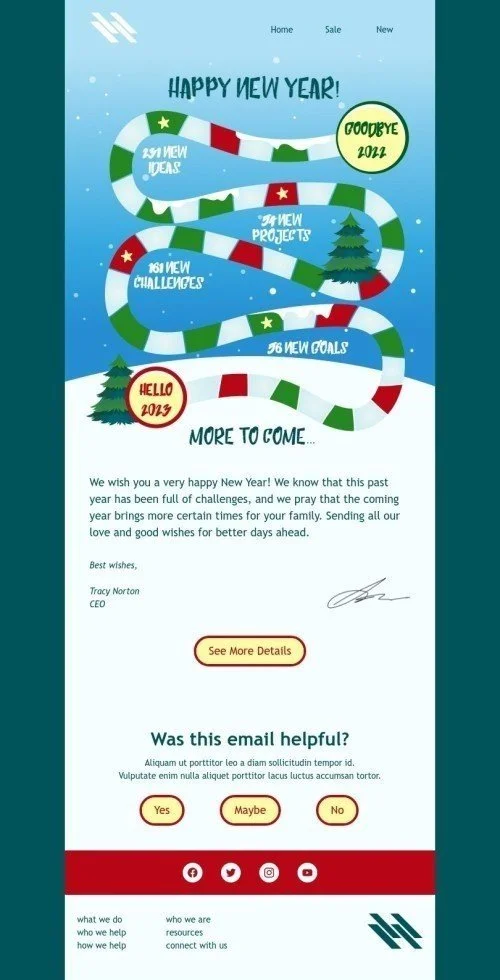 Our New Year Email Template “Hello New Year” is designed to help businesses welcome and embrace the start of a new year. This template provides a professional and upbeat way to express appreciation for the support and partnership of clients, and to set the tone for a successful and productive year ahead. With this template, you can share your company's achievements and goals, and show your enthusiasm for the opportunities and challenges that the new year brings. Use this template to strengthen relationships and build momentum as you enter the new year.